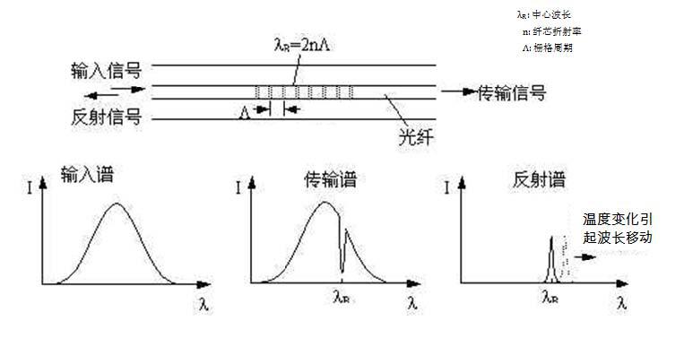 光柵也是普通單模光纖,作為光纖傳感器。但是光柵要經(jīng)過(guò)特殊的加工處理以改變其折射率,使其只對(duì)特定的波長(zhǎng)進(jìn)行反射。這樣,一個(gè)寬譜的入射光經(jīng)過(guò)光纖光柵后,只有滿足波長(zhǎng)匹配條件的極小譜寬的光信號(hào)被反射,其余波長(zhǎng)的光信號(hào)透射進(jìn)入下一個(gè)光纖光柵。當(dāng)環(huán)境溫度變化時(shí),光纖光柵的反射光中心波長(zhǎng)會(huì)隨之改變(溫度越高,波長(zhǎng)偏移量越大)。通過(guò)對(duì)待測(cè)光柵的反射光中心波長(zhǎng)進(jìn)行數(shù)字化精確測(cè)量,即可獲得該光柵位置的環(huán)境溫度,如圖1所示。