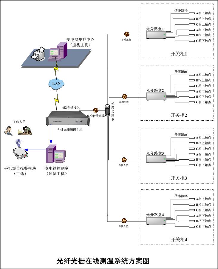 光纖光柵傳感器使用導(dǎo)熱硅膠直接安裝在開(kāi)關(guān)柜內(nèi)各閘刀、觸點(diǎn)位置。測(cè)溫主機(jī)為16通道,每通道最多可對(duì)12點(diǎn)進(jìn)行溫度監(jiān)測(cè),如果每個(gè)變電站需監(jiān)測(cè)觸點(diǎn)數(shù)量小于192使用1臺(tái)測(cè)溫主機(jī)可以覆蓋整個(gè)變電站所有開(kāi)關(guān)柜。測(cè)溫主機(jī)的輸出信號(hào)送到上位機(jī)進(jìn)行集中顯示和報(bào)警輸出,并可以送到火災(zāi)報(bào)警控制器進(jìn)行告警和消防聯(lián)動(dòng)。如果要在遠(yuǎn)端集中監(jiān)控所有測(cè)溫主機(jī),每個(gè)測(cè)溫主機(jī)端要增加遠(yuǎn)程通信模塊,方便遠(yuǎn)程進(jìn)行集中監(jiān)控。
