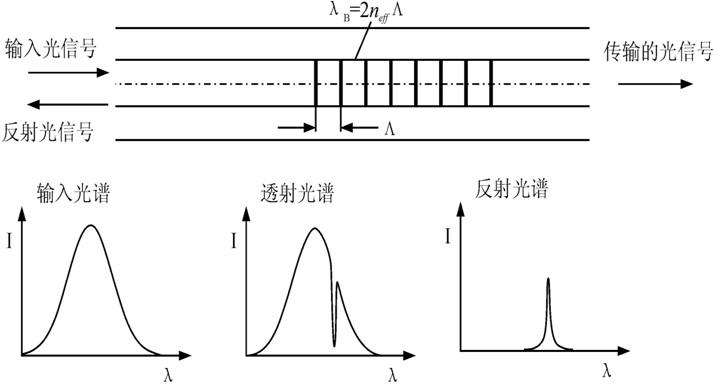 光柵是光纖經過特殊的加工處理以改變其折射率,使其只對特定的波長進行反射。這樣,一個寬譜的入射光經過光纖光柵后,只有滿足波長匹配條件的極小譜寬的光信號被反射,其余波長的光信號透射進入下一個光纖光柵。當環(huán)境溫度變化時,光纖光柵的反射光中心波長會隨之改變(溫度越高,波長偏移量越大)。通過對待測光柵的反射光中心波長進行數字化精確測量,即可獲得該光柵位置的環(huán)境溫度,如圖1所示。