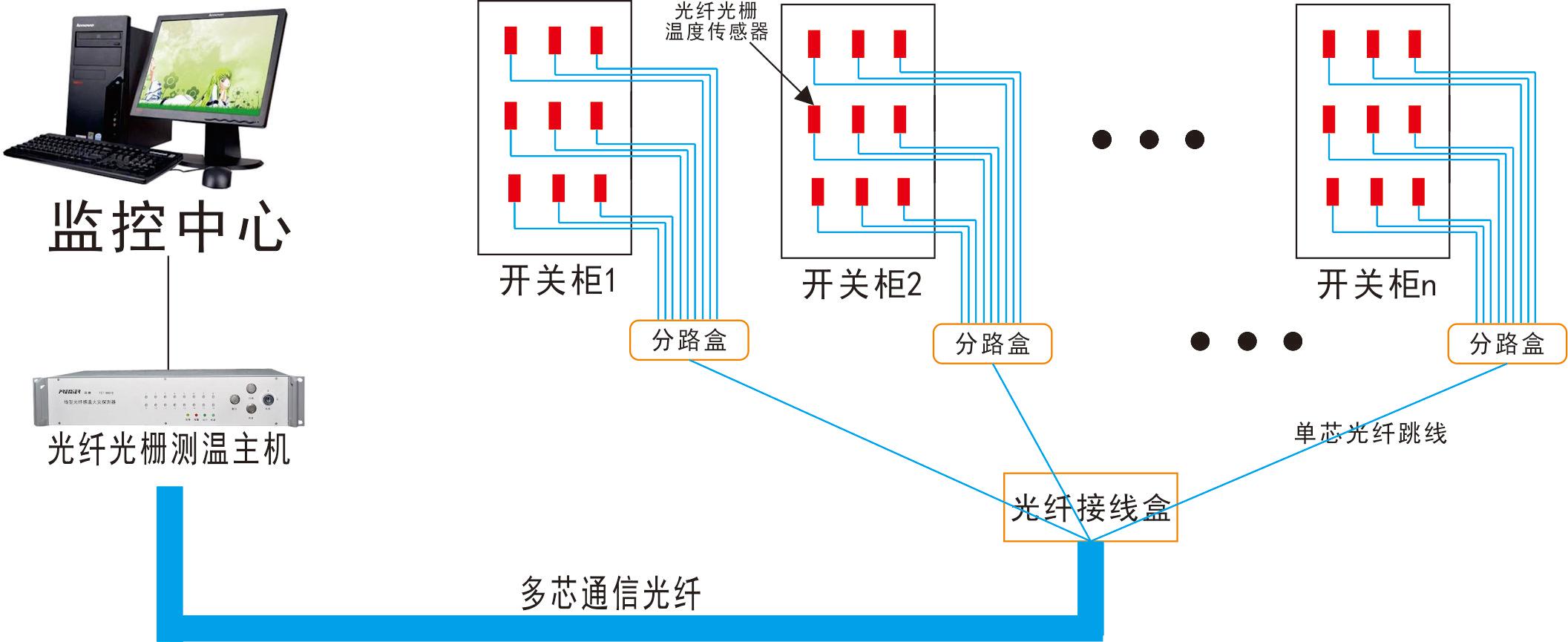 高壓電氣設備光纖光柵溫度在線監(jiān)測系統(tǒng)主要由光纖光柵解調儀和光纖光柵傳感器組成。通過多路光纜,將傳感器連接起來構成電氣設備溫度監(jiān)測網絡,通過以太網連接設備將光柵解調儀、上位機等構成溫度監(jiān)測預警管理系統(tǒng),并可實現系統(tǒng)互聯,溫度數據實時共享的功能。監(jiān)測裝置的終端設在各變電所高壓電纜沿線接頭等重要部位、高壓電纜頭等需要監(jiān)測的地方。